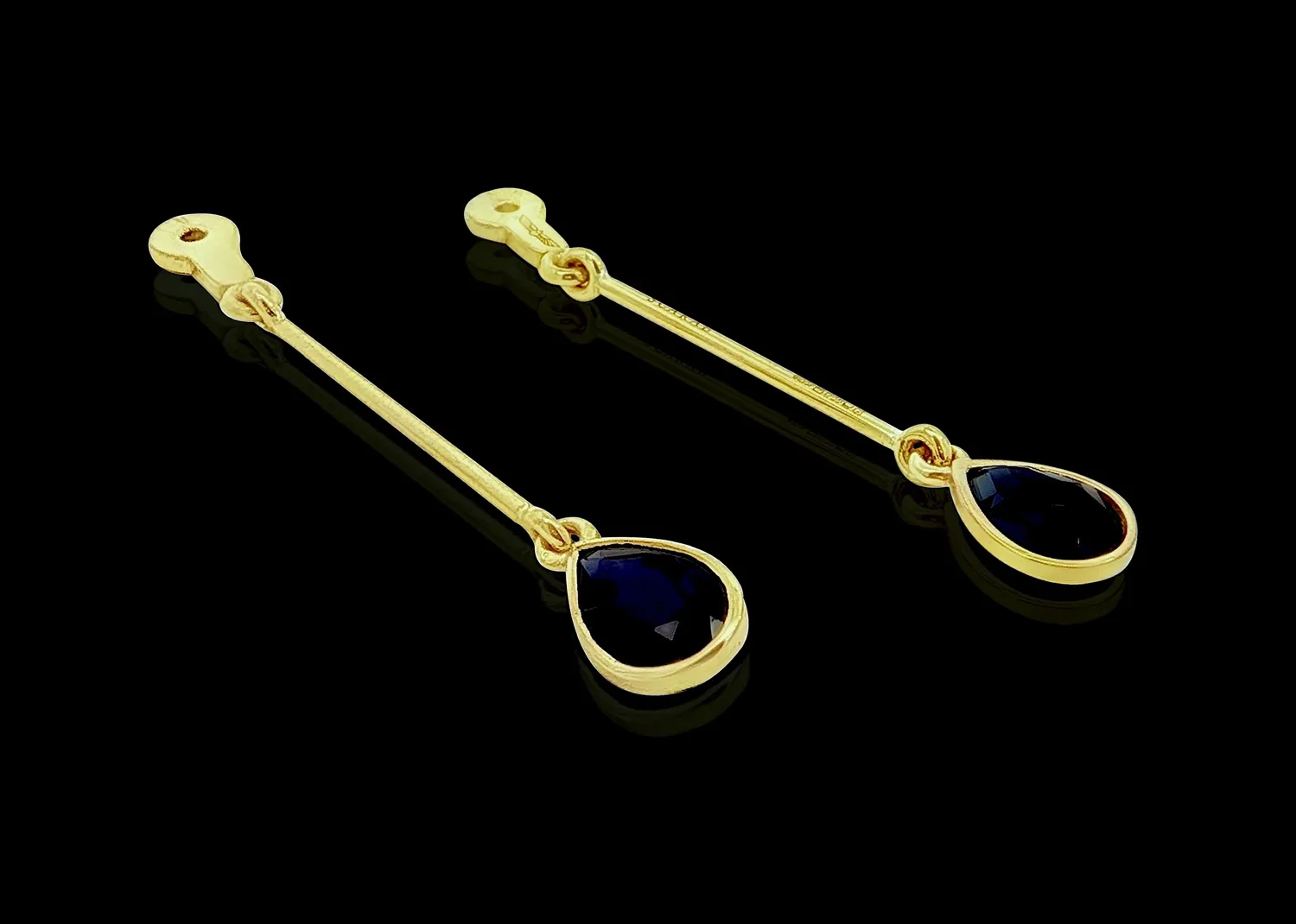 There is an articulated long 18ct yellow gold wire dropping off which is a pear shaped blue sapphire in a rubover setting.