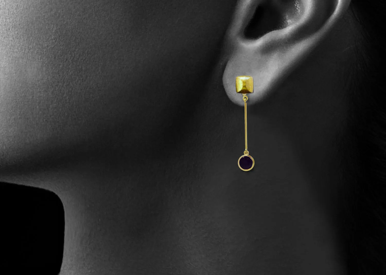 There is an articulated long 18ct yellow gold wire dropping off which is a round cabochon amethyst in a rubover setting.