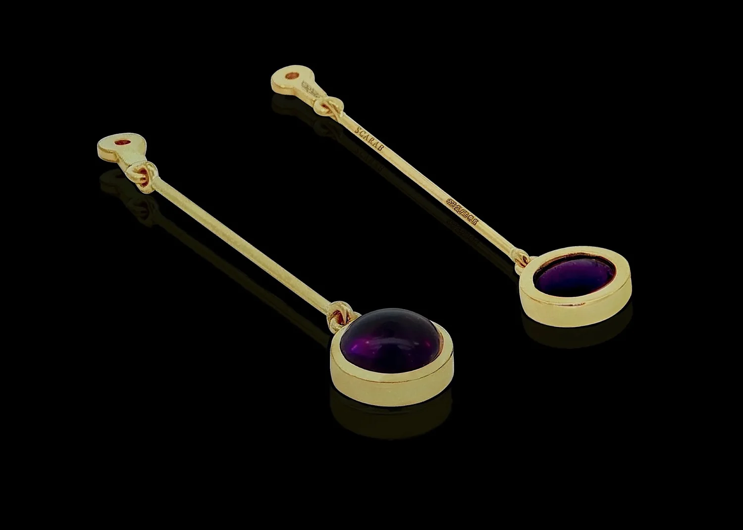 The drops are hallmarked by the London Assay Office for 18ct gold, 2025 and bear the sponsor's mark 'A&SP' for Alan & Sue Poultney and are lasered with 'Scarab' and the Jewels by Scarab winged beetle logo..