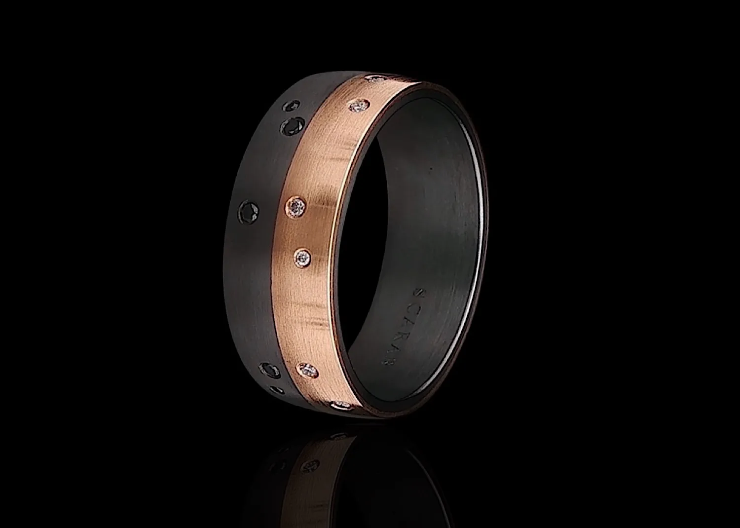 This gents ring is made of tantalum and brushed 9ct rose gold.