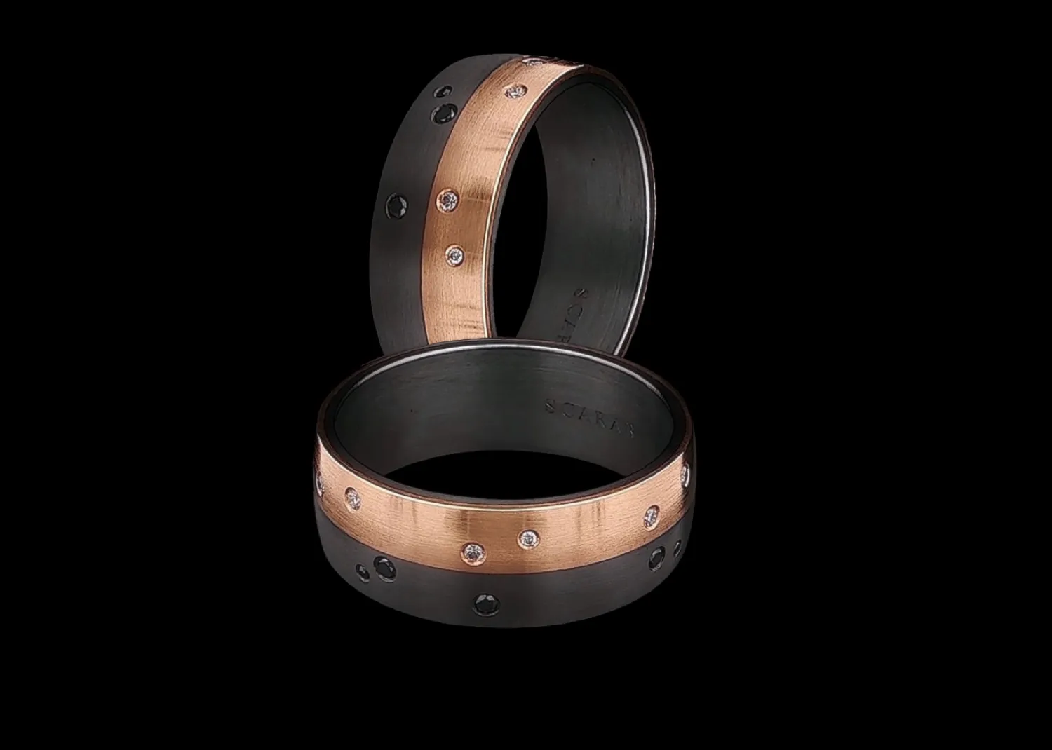 The tantalum is set with thirteen round black diamonds of various sizes and the 9ct rose gold is set with thirteen round white diamonds of various sizes.