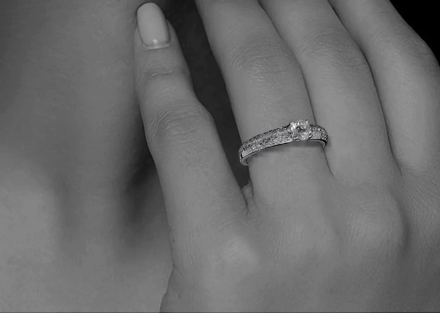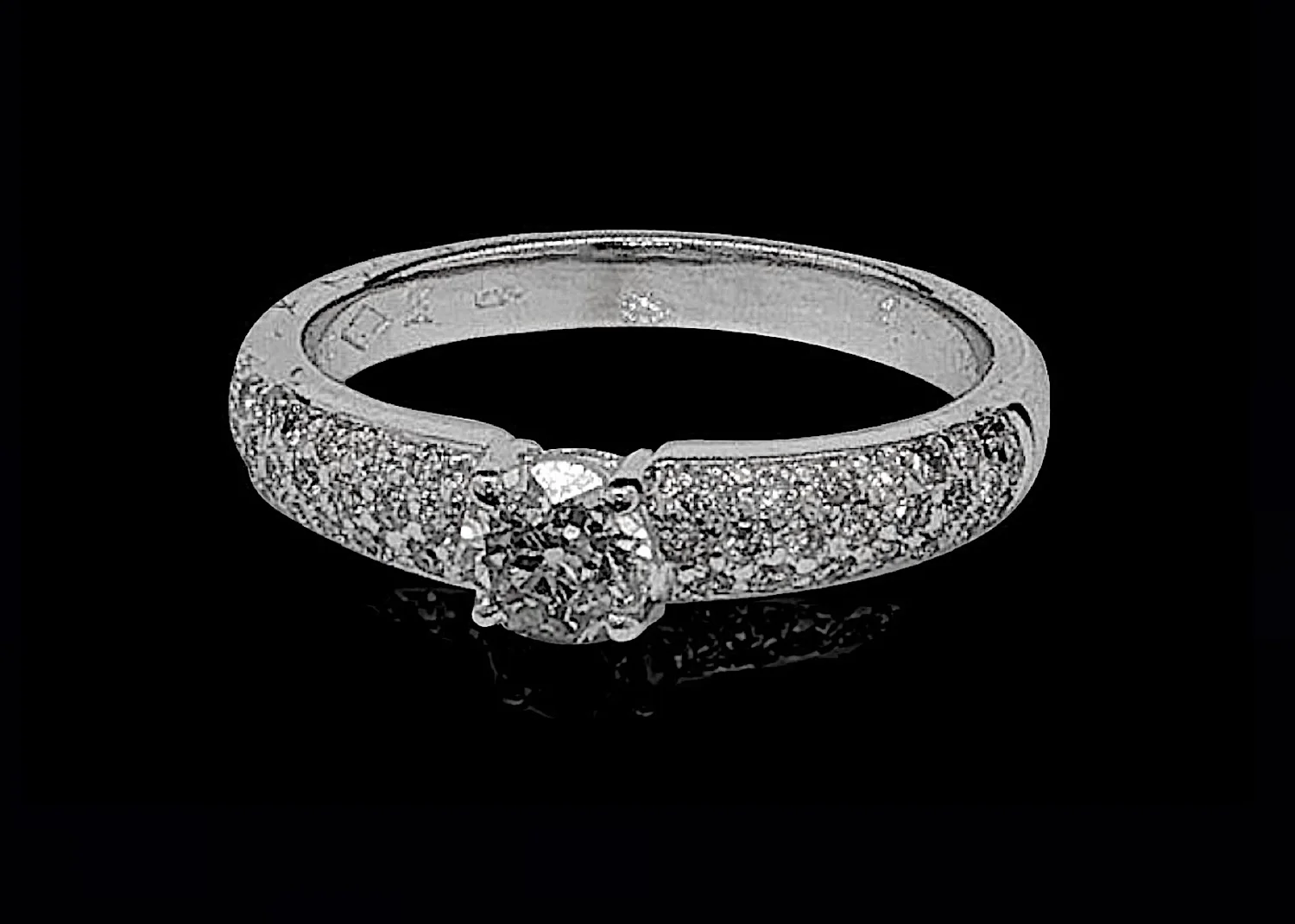 There are a total of forty-four small round diamonds grain set into the shoulders with a total estimated weight of 0.35ct.