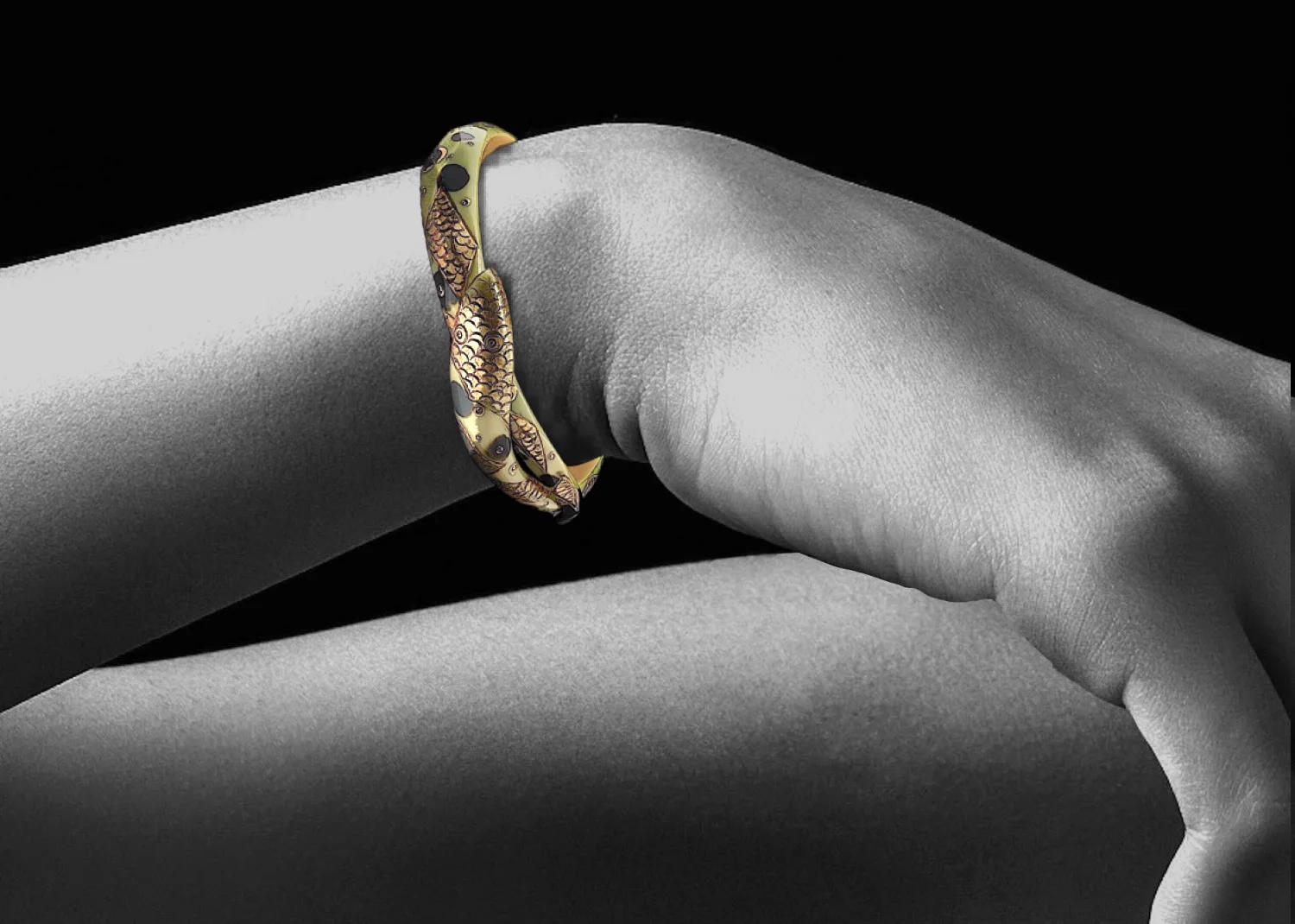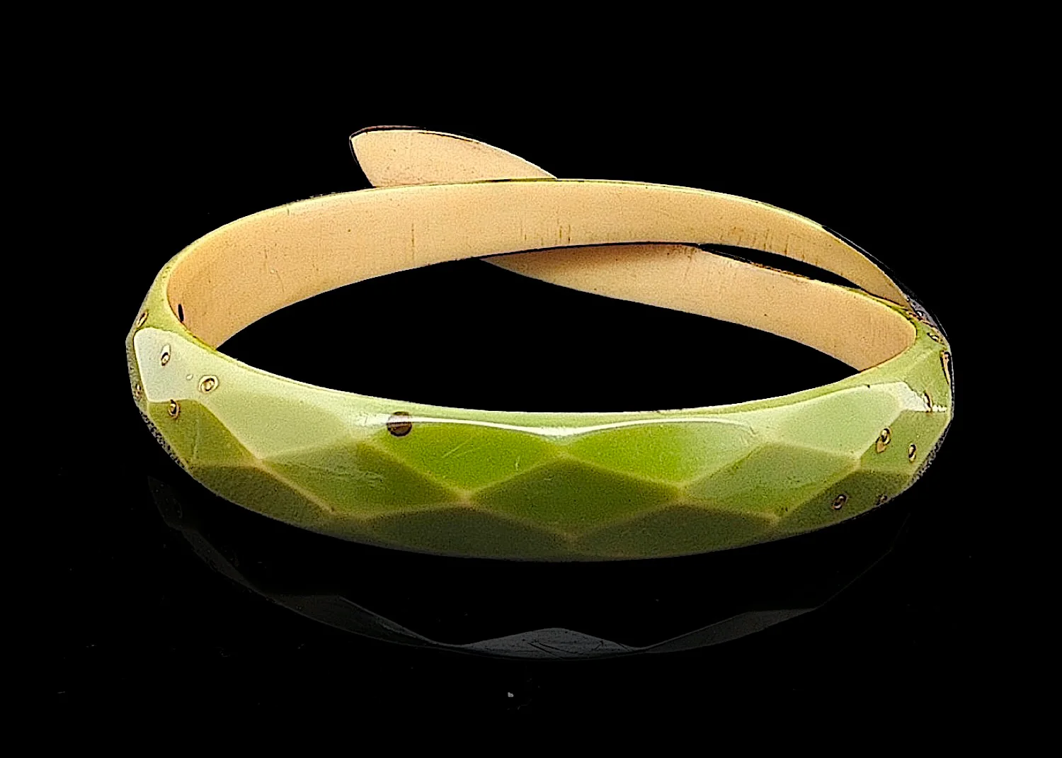 The bangle has a carved diamond pattern and is green with black and gold decoration the latter being sightly raised and representing scales.
