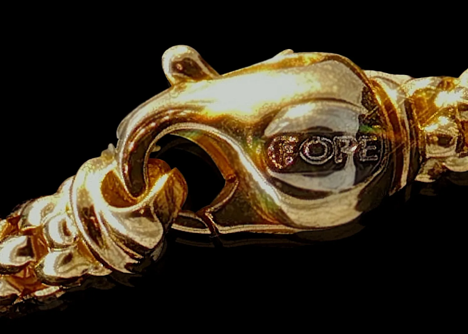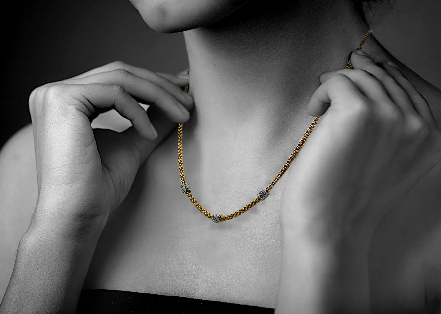 The 18ct yellow gold woven style chain is set with three 18ct white gold rondels.