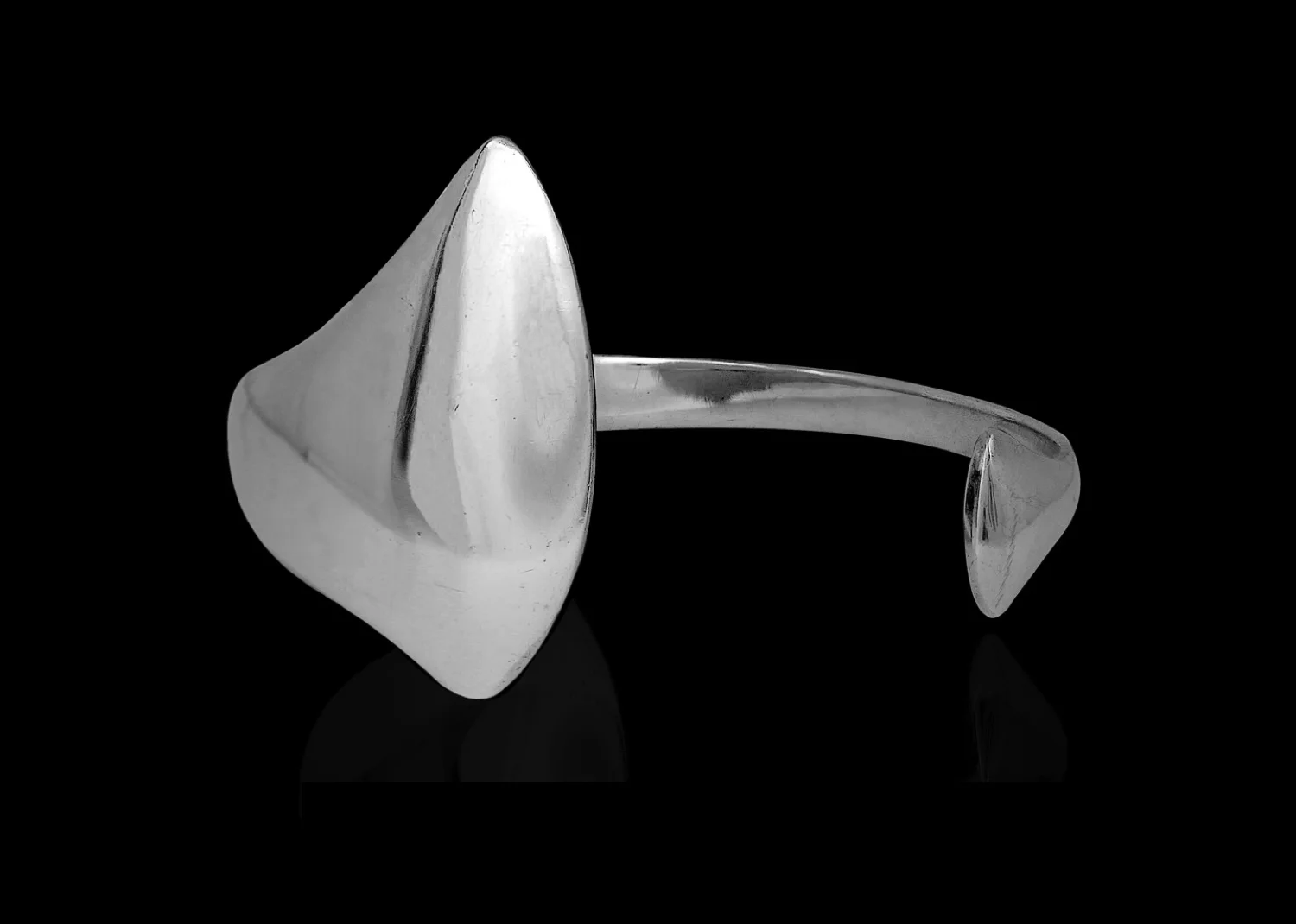 The cuff terminates in two rounded triangular shaped finials of different sizes.