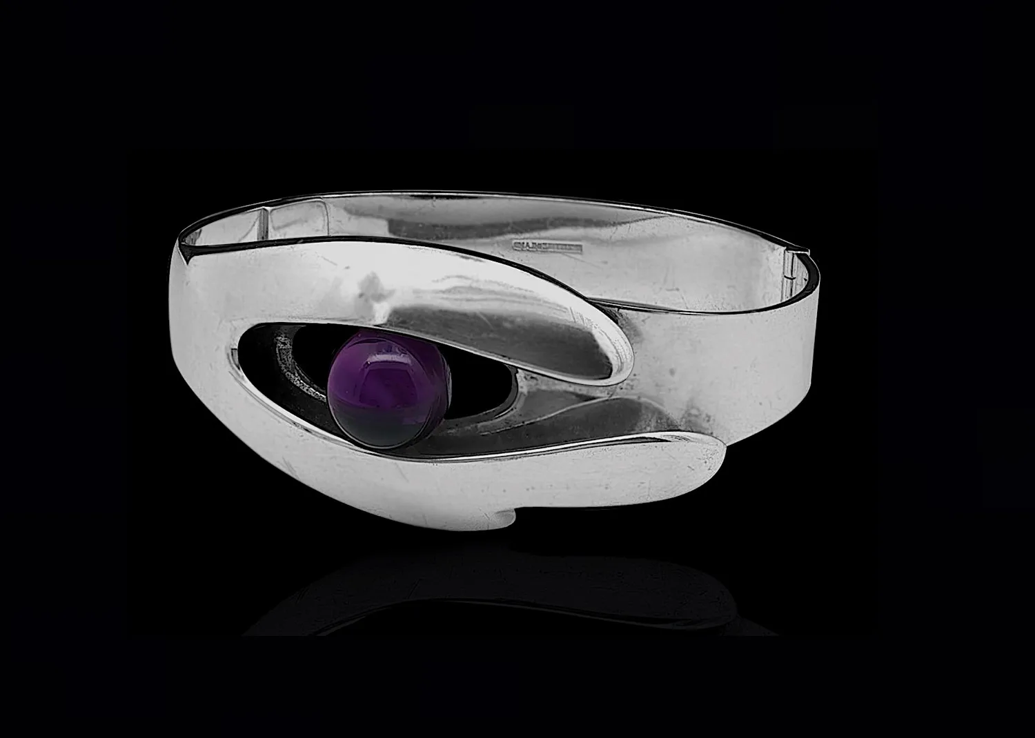 The amethyst has been set upside down so that the multiple facets on the underneath of the gemstone are visible.