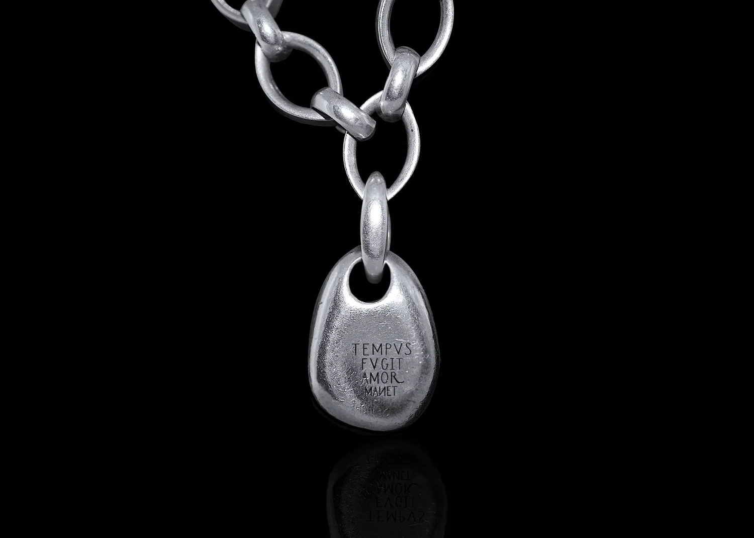 The charm is engraved with the Latin phrase 'Tempus fugit amore manet' which translates as 'Time flies love endures".
